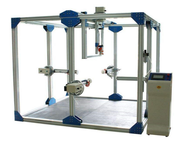 走步機靜載強度試驗裝置完全滿足中國文教體育用品協(xié)會團體標準T/CSSGA 1023—2019 《走步機》中第5.7章節(jié) “靜載荷”試驗要求。本裝置通過圓盤式加載墊從走步表面的前端記起1/3處,并在走步表面寬度的中心,300mm×300mm的區(qū)域施加試驗載荷;如試驗過程走步表面發(fā)生滑動,走步表面可以固定。試驗保持1min。以此來檢查走步機整體和組件是否發(fā)生明顯的破裂和變形,以考核走步機的負荷強度是否滿足標準試驗要求。