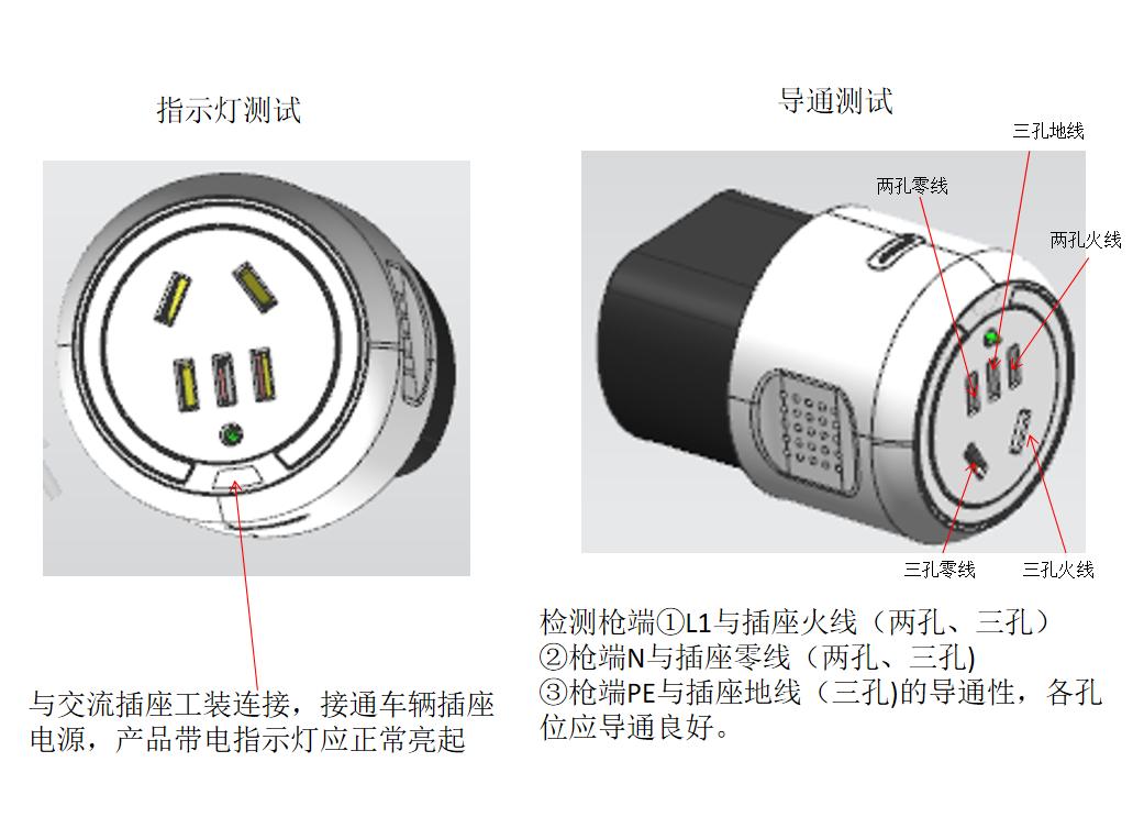 2. 導通極性檢測:檢測充電槍頭部與尾部出線間的導通與極性