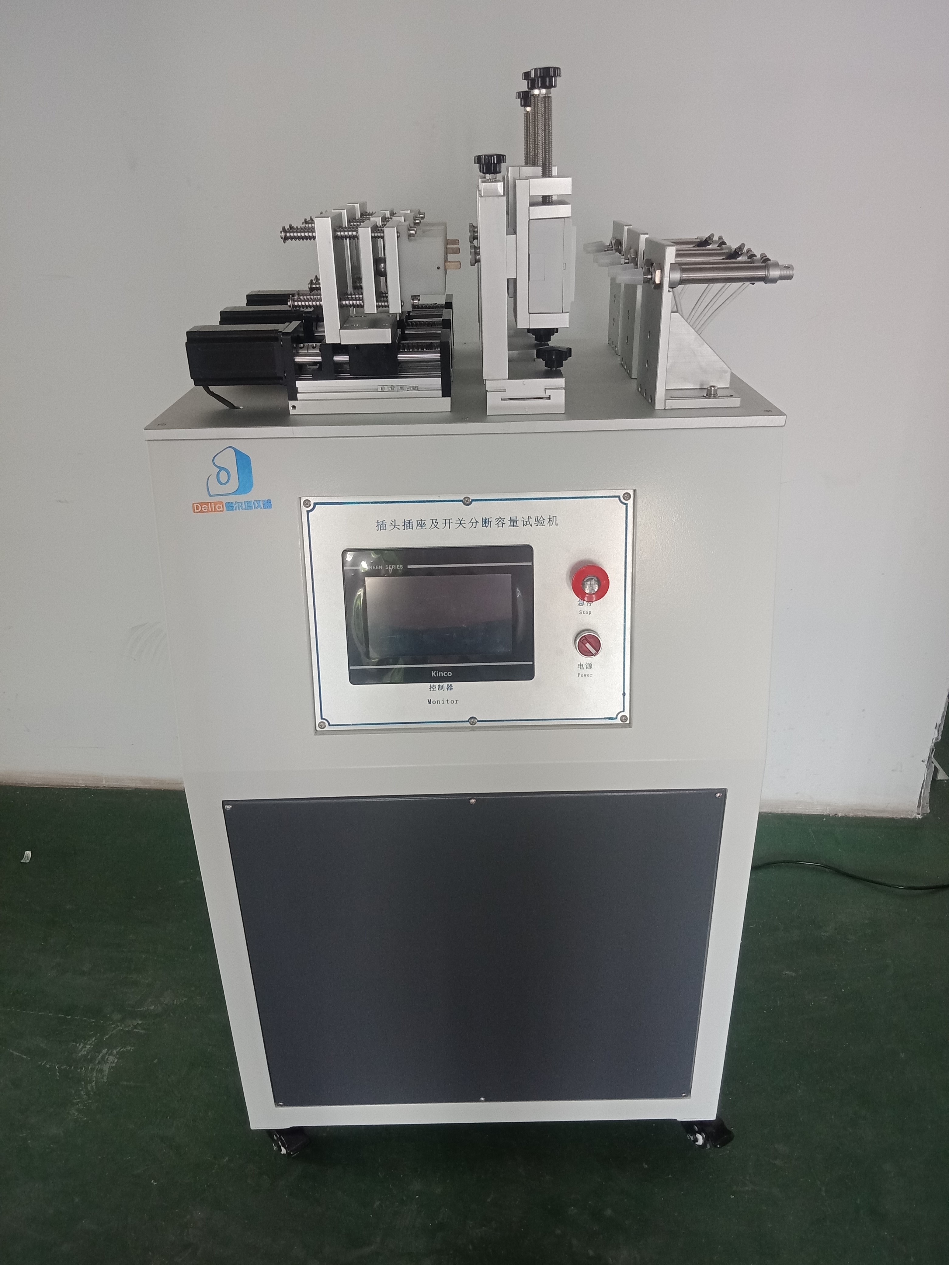 14 | 插頭插座分斷容量及正常操作試驗機 (GS-SMT1003) | 符合標準:GB/T2099.1-2021標準第20、21章節及圖16、圖17的試驗要求。 | 一、概述:本試驗機用于檢驗插頭與插座之間在經過一定次數的插入與拔出后的損壞程度,考核電器附件的分斷容量及插頭插座的壽命性能。本試驗機可與電器附件負載柜連接,可用于考核插頭與插座的電氣壽命試驗;本機配合負載柜還適用于插頭插座試樣的正常操作和分斷容量試驗。 二、符合標準:依據GB/T2099.1-2021標準第20、21章節及圖16、圖17的試驗要求。 二、主要技術參數: 插頭插座機械壽命試驗機本機有兩種結構形式:機械傳動結構和氣動元件結構。 1、動作速率: 1~30次/min可調節; 2、控制方式:PLC智能控制,TFT液晶觸摸屏操作; 3、工作行程:大于50mm(可根據客戶要求訂制); 4、試驗工位:3工位; 5、具有測試異常自動報警和漏電保護功能; 6、試驗次數:1~999999次可預置; 7、驅動方式:進口伺服電機驅動; 8、 體積:900X500X1600mm; 9、負載連線方式:配有接線端子; 10、分斷容量測試插頭治具的插銷由黃銅制成(原料為符合ISO1639標準規定的CuZn39 Pb2-M型),插銷具有最大規定尺寸,偏差為-0.06mm,插銷間距為標稱距離,偏差為+0.05mm; 11、6A單相兩極插頭治具 1個; 12、10A單相兩極帶接地插頭治具 1個; 13、16A單相兩極帶接地插頭治具 1個; 14、最大連接電流:AC 25A; 15、 最大連接電壓:AC 300V; 16、 電源功率:1kVA ,220V 50/60Hz。 |